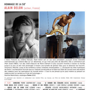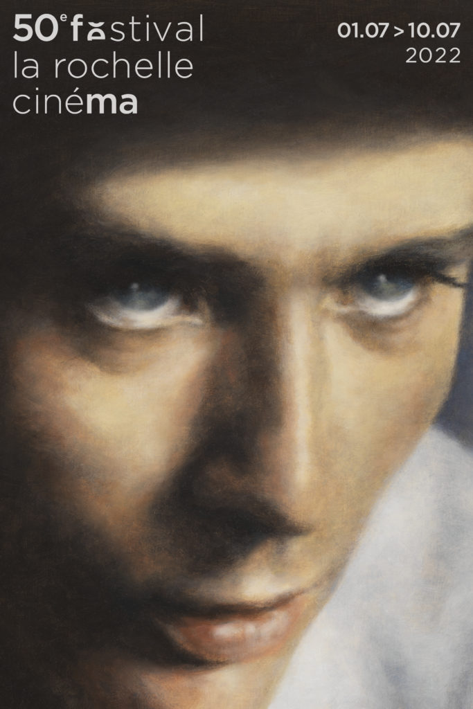 Affiche « L’affiche du 50e festival est un œil. Magnétique et inquiétant, cet œil, qui séduit et qui trouble, qui envoûte le spectateur des salles obscures, est celui d’Alain Delon dans Plein Soleil où le jeune acteur français fait une entrée triomphale dans le palais des artifices, des illusions et des mirages qu’est le cinéma célébré, comme chaque année, à La Rochelle. » Stanislas Bouvier