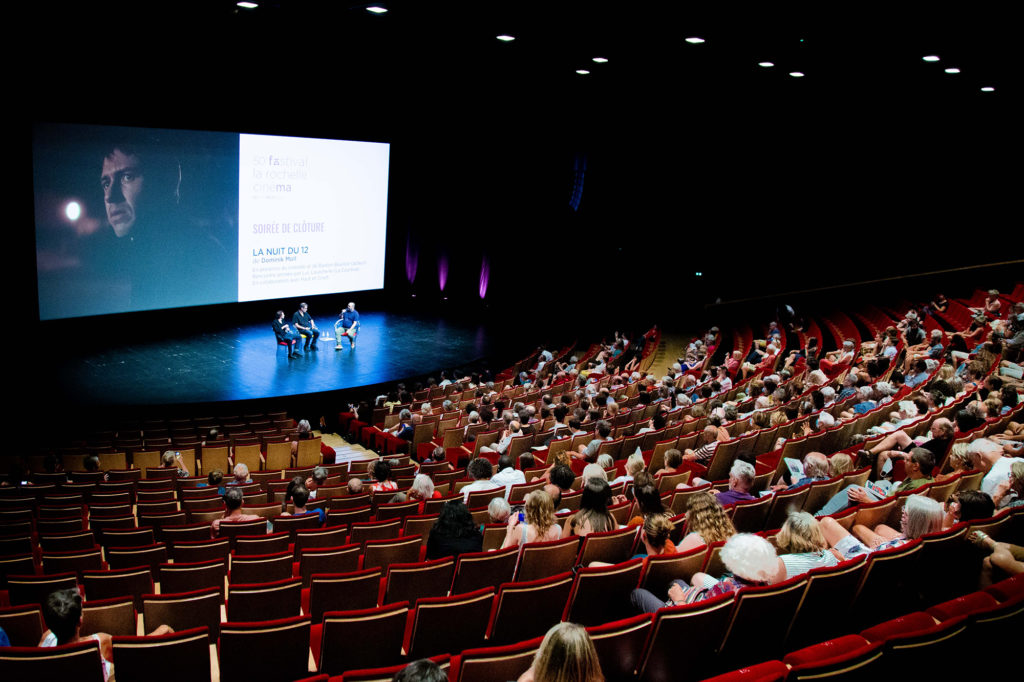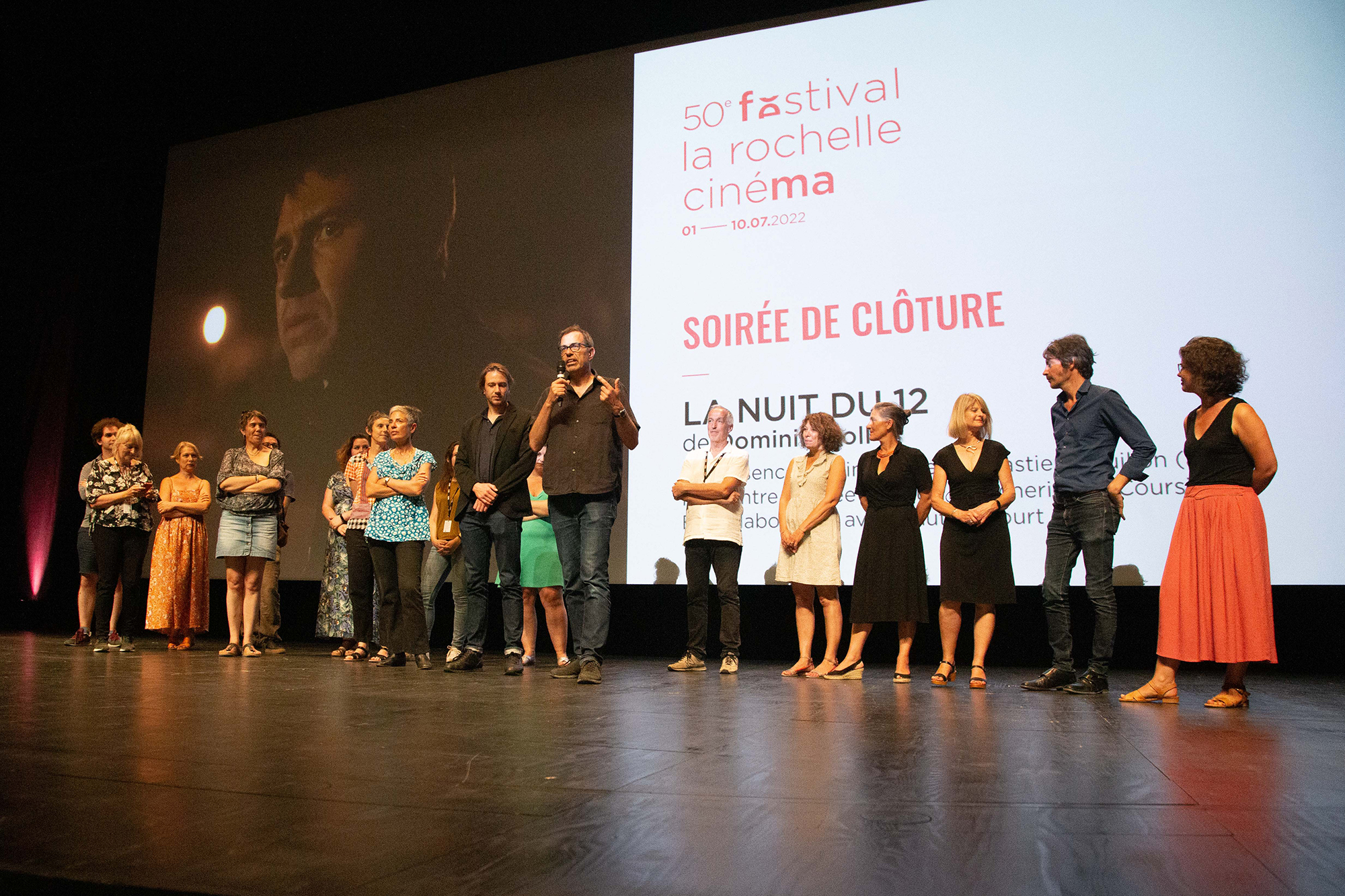Sur scène : l'équipe du film La Nuit du 12 et l'équipe du festival —